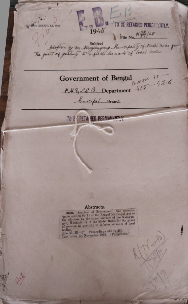 | Rack No. 13, Bundle No. 30, Sl No. 2028 Reconstitution Sherpur Municipality (Mymensingh). | Rack No. 13, Bundle No. 30, Sl No. 2029 Proposed reservation of Seats for Muslims in the Ranaghat Municipality. | Rack No. 13, Bundle No. 30, Sl No. 2030 Reconstitution of the Mymensingh Municipality. | Rack No. 13, Bundle No. 30, Sl No. 2031 Adoption by the Narayanganj Municipality of Model Rules for the grant of gratuity to inferior Servants of Local bodies. | Rack No. 13, Bundle No. 30, Sl No. 2032 Proposal extension of the term of office of the commissioners of the Kotchandpur Municipality. | Rack No. 13, Bundle No. 30, Sl No. 2033 Validity of Serving a distress warrant bared on a demand notice Served for more than one bill. | Rack No. 13, Bundle No. 30, Sl No. 2034 Extension of the term of office of the commissioners of the Berhampore Municipality. |