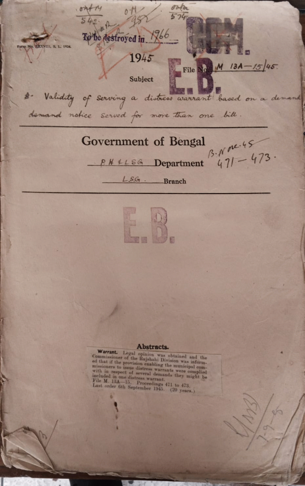 | Rack No. 13, Bundle No. 30, Sl No. 2030 Reconstitution of the Mymensingh Municipality. | Rack No. 13, Bundle No. 30, Sl No. 2031 Adoption by the Narayanganj Municipality of Model Rules for the grant of gratuity to inferior Servants of Local bodies. | Rack No. 13, Bundle No. 30, Sl No. 2032 Proposal extension of the term of office of the commissioners of the Kotchandpur Municipality. | Rack No. 13, Bundle No. 30, Sl No. 2033 Validity of Serving a distress warrant bared on a demand notice Served for more than one bill. | Rack No. 13, Bundle No. 30, Sl No. 2034 Extension of the term of office of the commissioners of the Berhampore Municipality. | Rack No. 13, Bundle No. 30, Sl No. 2035 Revision of boundaries of the Serajganj Municipality | Rack No. 13, Bundle No. 30, Sl No. 2036 Institution of the Rajshahi Municipality. |