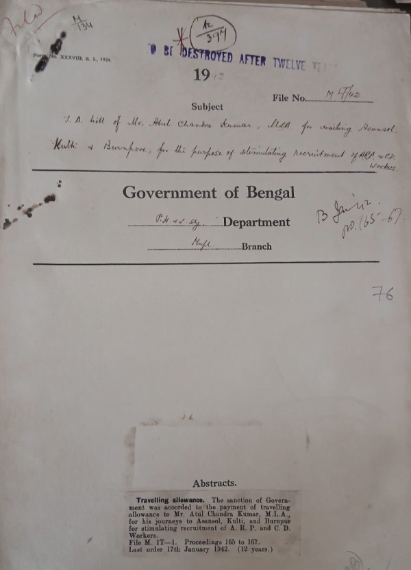 T.A. Bill of Mr. Atal Chandra Kumar. M.L.A. for visiting Asansol Kulti & Burnpur, for the purpose of Stimulating recruitment of A.R.P. & C.D. Workers.