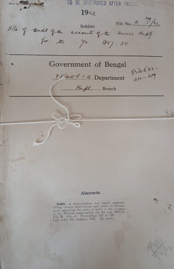 | Rack No. 13, Bundle No. 23, Sl No. 1581 Revision of forms regarding Omission of Calumn 14 about Municipal expenditure on Police establishment in form No. III. | Rack No. 13, Bundle No. 23, Sl No. 1582 Sanction to irregular withdrawal from P.F. Account of Employees of the Nabadwip Municipality us 104 (i) (ii) of the B.M. Act. | Rack No. 13, Bundle No. 23, Sl No. 1583 Revision of assessment of the Taki Municipality. | Rack No. 13, Bundle No. 23, Sl No. 1584 Note of audit of the accounts of the Howrah Municipality for the year 1937-38. | Rack No. 13, Bundle No. 23, Sl No. 1585 Sanction to Contribution of Rs. 50/- by the Bhadresswar Municipality towards the maintenance of Serampur Sub divisional Tuberculosis Association. | Rack No. 13, Bundle No. 23, Sl No. 1586 Amendment of Rule 5 of the P.F. Rules under the Bengal Municipal Act, 1932 | Rack No. 13, Bundle No. 23, Sl No. 1587 Proposed addition to rule 10 of the P.F. Rules of the C.I. Trust. |