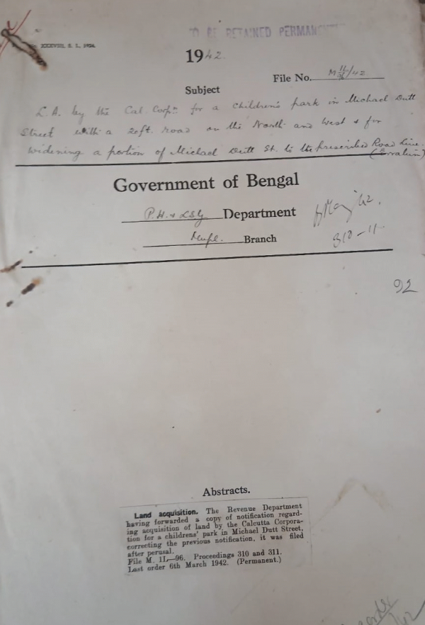 LA. by the Calcutta Corporation for a Children Park in Michael Dutt Street with a 20ft. rond on the Nort and West & for widening a portion of Michel Datt street to the prescribed Road.