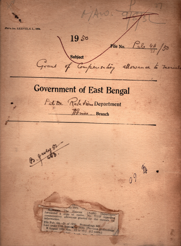 | Rack No. 18, Bundle No. 05, SI No. 324 Proposed creation of an additional post of a L.D. Assistant in Assistant translation office. | Rack No. 18, Bundle No. 05, SI No. 325 Verification of Service of Sri. Brojendra Nath Kar, Compound, District Mobile Unit, Midnapore. | Rack No. 18, Bundle No. 05, SI No. 326 Arrangement for drawing arrear increment of pay of Md. Idris, Peon D.M. Unit, Pabna. | Rack No. 18, Bundle No. 05, SI No. 327 Grant of compensatory allowance to menials. | Rack No. 18, Bundle No. 05, SI No. 328 Repairs of the Cinema equipment D.M. Unit, Pabna. | Rack No. 18, Bundle No. 05, SI No. 329 Pay of Mvi. Syed Manwar Hossain was fixed in the Prescribed Scale. | Rack No. 18, Bundle No. 05, SI No. 330 Complain against Babu Ganga Charan Poddar, S.D.P.O. Chandpur, by Mr. K.H. Chowdhury and the people of Chandpur. |