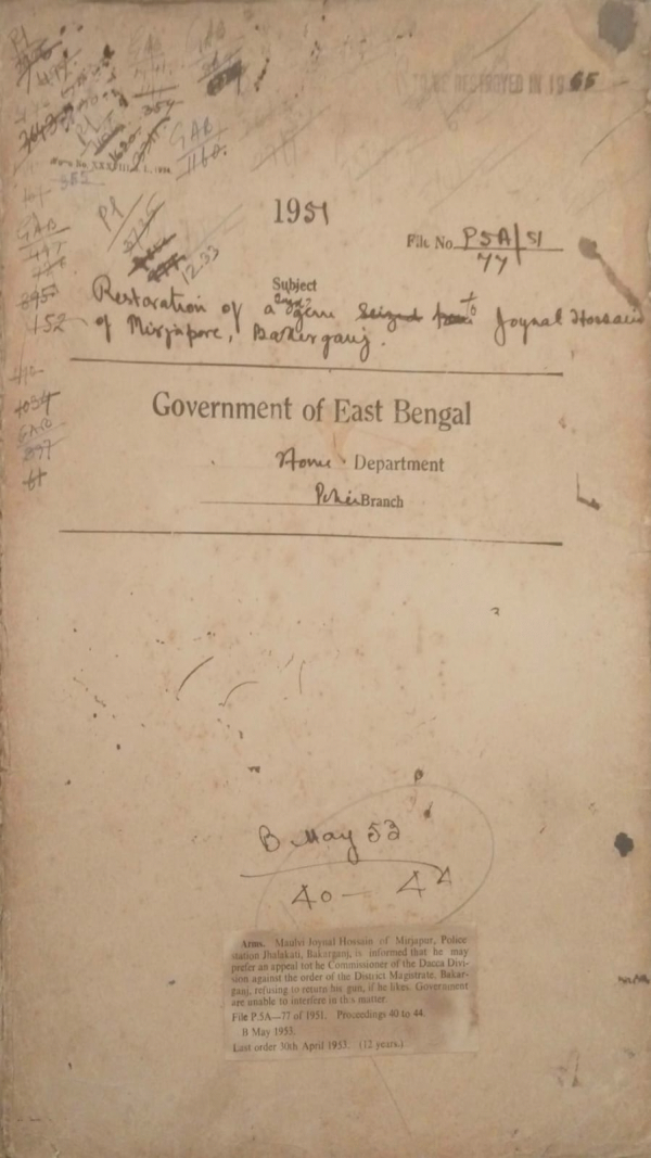 | Rack No. 25, Bundle No. 132, SI No. 12,160 Allotment of funds under the police act to the District of Kushtia. | Rack No. 25, Bundle No. 132, SI No. 12,161 Realization of house rent to the Finance and revenue Department. | Rack No. 25, Bundle No. 132, SI No. 12,162 Acquisition of 62 acre of land for construction of border police outpost at Karia(Chardipur) P.S. Panchbibi, District, Bogra. | Rack No. 25, Bundle No. 132, SI No. 12,163 Restoration of a gun seized from Mvi. Joynal Hossain. | Rack No. 25, Bundle No. 132, SI No. 12,164 Retention of temporary staff for strengthen District emergency Forces. | Rack No. 25, Bundle No. 132, SI No. 12,165 Extra Prosecuting staff for Thakurgaon court in Dinajpur District. | Rack No. 25, Bundle No. 132, SI No. 12,166 Petition from Sub-Inspector Jinnat Ullah Meah for bringing his furniture from Jalpaiguri. |