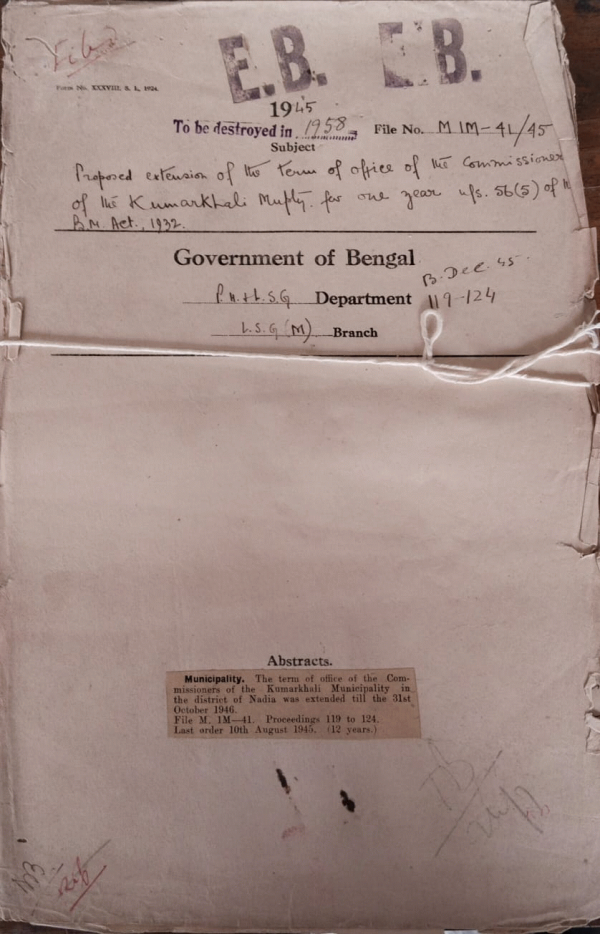 | Rack No. 13, Bundle No. 30, Sl No. 2050 L.A. by the Barisal Municipality for the construction the4 New Mohammadan Burial ground approach Roads Park Reserve Tanks and for the recoupment of the cost there of in the village of Bagura Alekanda. | Rack No. 13, Bundle No. 30, Sl No. 2051 L.A. by the Dacca Municipality for opening a Methor's Passage at Debendra Das Lane in the Town of Dacca Municipality. | Rack No. 13, Bundle No. 30, Sl No. 2052 Revision of boundary of the Madaripur Municipality. | Rack No. 13, Bundle No. 30, Sl No. 2053 Appointment of a Head Clerk and Accountant f the Berhampore Municipality. | Rack No. 13, Bundle No. 30, Sl No. 2054 Proposed extension of the term of office of the commissioner of the Kumarkhali Municipality of the B.M. Act, 1932. | Rack No. 13, Bundle No. 30, Sl No. 2055 Proposal for extension of the term of office of the commissioner of the Khulna Municipality. | Rack No. 13, Bundle No. 30, Sl No. 2056 Town Planning in Chittagong Area. |