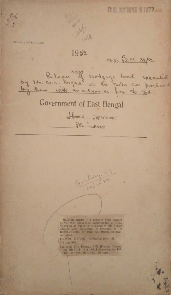 Release of mortgage bond executed by Mr. M.S. Haque the motor car purchase by him with advance from Govt.