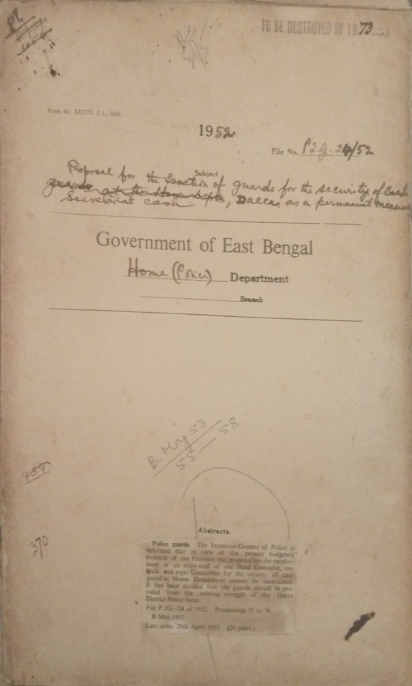 | Rack No. 25, Bundle No. 132, SI No. 12,179 Verification of death and legal heirs of literate Constable Sri Haran Chandra Ghosh. | Rack No. 25, Bundle No. 132, SI No. 12,180 Police escort required by the Census Superintendent East Pakistan, Dacca , on pay day. | Rack No. 25, Bundle No. 132, SI No. 12,181 Payment of Charges on account of armoires course. | Rack No. 25, Bundle No. 132, SI No. 12,182 Proposal for the Sanction of guards for the Security of cash guard at the home department Dacca as a permanent measure. | Rack No. 25, Bundle No. 132, SI No. 12,183 Classification of Schemes assignment of Priorities to Schemes. | Rack No. 25, Bundle No. 132, SI No. 12,184 Acquisition of 1.71 acres land for rifle range at Magura Jessore. | Rack No. 25, Bundle No. 132, SI No. 12,185 Proposal for the retention of the staff for their offices as a permanent measure is dropped. |