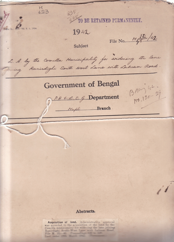L.A. by the Comilla Municipality for widening the lane joining the Ranirdighi south-west lane with laksam road.