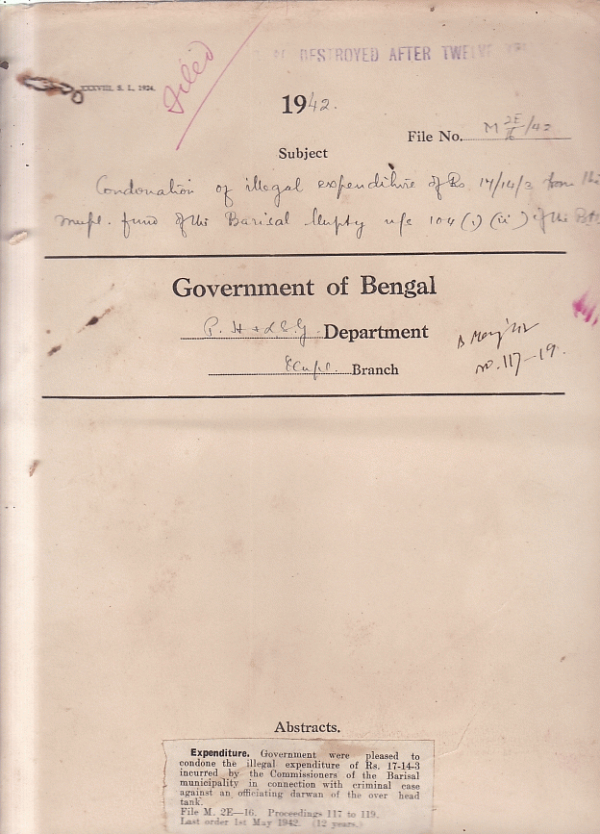 Expenditure of Rs. 17-14-3 from the Municipality fund of the Barisal Municipality u/s 104 (i) (ii) of the B.M. Act.