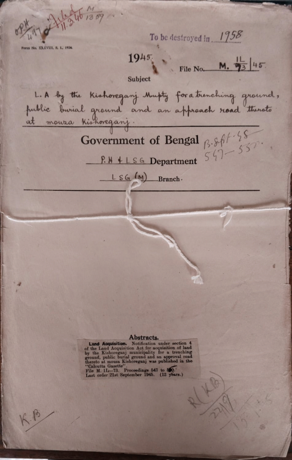 L.A. by the Kishoreganj Municipality for a trenching ground, Public burial ground and an approach road there to at mouza Kishoreganj.