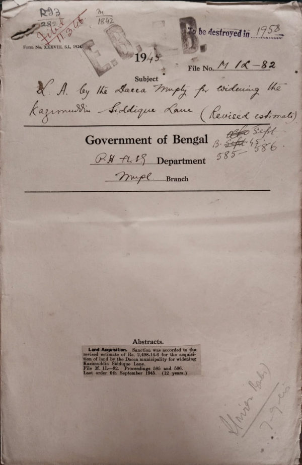 | Rack No. 13, Bundle No. 30, Sl No. 2056 Town Planning in Chittagong Area. | Rack No. 13, Bundle No. 30, Sl No. 2057 L.A. by the Nabadwip Municipality for a park. | Rack No. 13, Bundle No. 30, Sl No. 2058 L.A. by the Kishoreganj Municipality for a trenching ground, Public burial ground and an approach road there to at mouza Kishoreganj. | Rack No. 13, Bundle No. 30, Sl No. 2059 L.A. by the Dacca Municipality for widening the Kazimuddin Siddique Lane. | Rack No. 13, Bundle No. 30, Sl No. 2060 Appointment of an assessor of the Noakhali Municipality for revision of assessment. | Rack No. 13, Bundle No. 30, Sl No. 2061 Financial assistance to the Nabadwip Municipality to enable them to supply cheap for staffs to their menials. | Rack No. 13, Bundle No. 30, Sl No. 2062 Extension of the Calcutta Hackney Carriage Act, 1919 to the Murshidabad Municipality. |