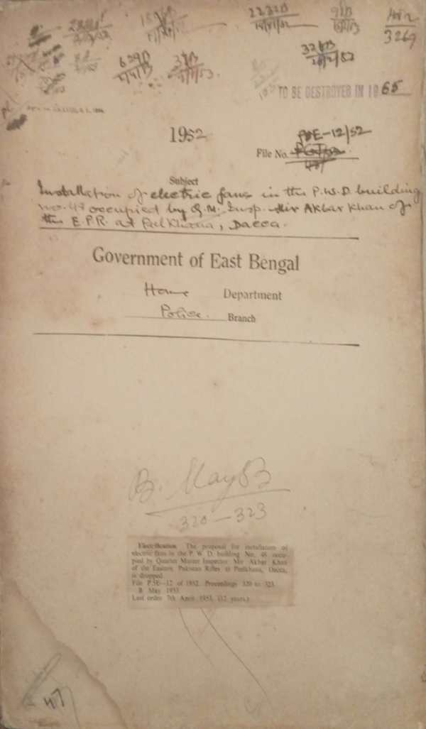 Installation of electric fans in the P.W.D. building no. 48 occupied by Q.M. Inspector Mir Akbar Khan of the E.P.R. at Peelkhana, Dacca.