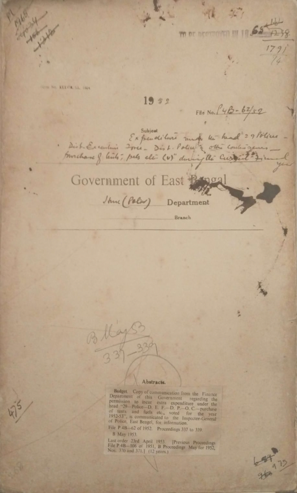 | Rack No. 25, Bundle No. 132, SI No. 12,185 Proposal for the retention of the staff for their offices as a permanent measure is dropped. | Rack No. 25, Bundle No. 132, SI No. 12,186 Installation of electric fans in the P.W.D. building no. 48 occupied by Q.M. Inspector Mir Akbar Khan of the E.P.R. at Peelkhana, Dacca. | Rack No. 25, Bundle No. 132, SI No. 12,187 Investigation of arrear claim of ex-lawyer prosecutor Mirza Sekandar Bakat. | Rack No. 25, Bundle No. 132, SI No. 12,188 Permission to incur extra expenditure under the head "District executive force District Police other contingencies purchase of tents pals, etc. | Rack No. 25, Bundle No. 132, SI No. 12,189 Repartition claim for repairs to motor launch "Esme" and transfer of Beaumont memorial trust Fund". | Rack No. 25, Bundle No. 132, SI No. 12,190 Complaint against Dr. Ajher Uddin Ahmed, President Ramma U.B. P.S. Chilmary, District Rangpur. | Rack No. 25, Bundle No. 132, SI No. 12,191 Purchase of vehicles for the E.P.R. |