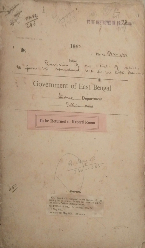 | Rack No. 25, Bundle No. 132, SI No. 12,194 Memorial ex-offg. S.I. Abdul Quddus Bhuyan of P.T.C. reserve office for restatement. | Rack No. 25, Bundle No. 132, SI No. 12,195 Installation of telephone connections in Bogra District. | Rack No. 25, Bundle No. 132, SI No. 12,196 Publication of notification regarding transfer of Some villages from the district of Dacca to that of Faridpur. | Rack No. 25, Bundle No. 132, SI No. 12,197 Revision of the list of articles to form the Standard kit for the E.P.R. Personnel. | Rack No. 25, Bundle No. 132, SI No. 12,198 Recruitment of S.I's for the year 1953. | Rack No. 25, Bundle No. 132, SI No. 12,199 Installation of a Plug Point for the telephone in the residence of the Dy. Inspector general of Police, I.B. | Rack No. 25, Bundle No. 132, SI No. 12,200 Retention of the temporary staff for the Dacca and Chittagong Aerodromes. |