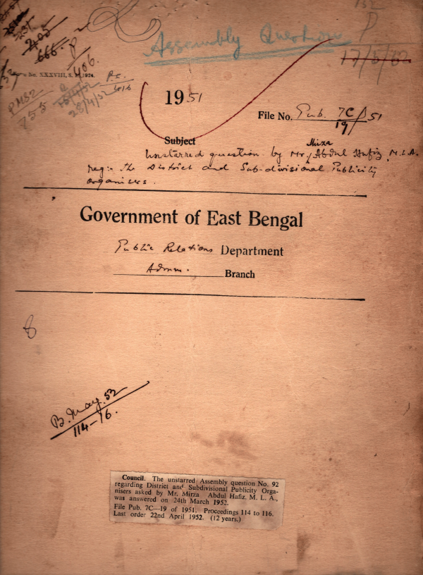 Unstirred A.Q. No. 92 regarding District and Sub- divisional publicity organizers asked by Mr. Mirza Abdul Hafiz M.L.A. was answered on 24th March 1952