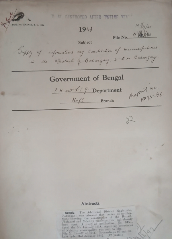Supply of information's regarding constitution of Municipalities in the District of Bakarganj.