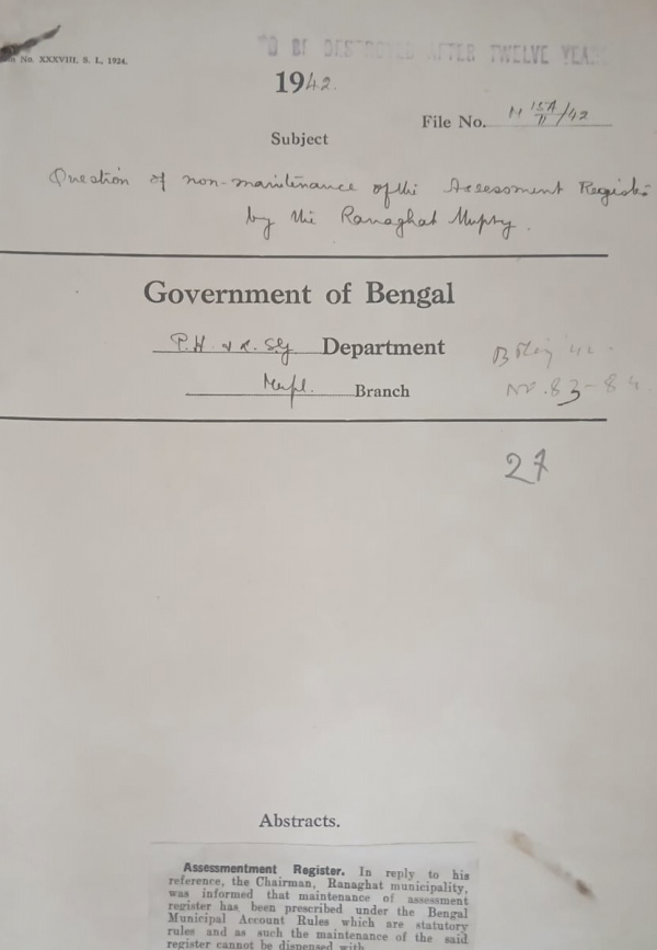 Question of non-maintenance of the Asessment Register by the Ranaghat Municipality.