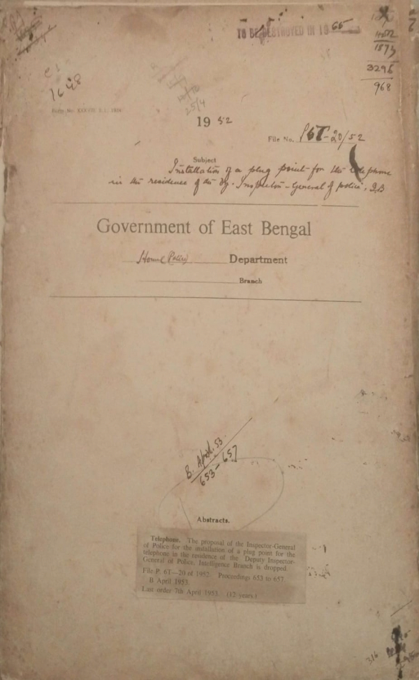 | Rack No. 25, Bundle No. 132, SI No. 12,196 Publication of notification regarding transfer of Some villages from the district of Dacca to that of Faridpur. | Rack No. 25, Bundle No. 132, SI No. 12,197 Revision of the list of articles to form the Standard kit for the E.P.R. Personnel. | Rack No. 25, Bundle No. 132, SI No. 12,198 Recruitment of S.I's for the year 1953. | Rack No. 25, Bundle No. 132, SI No. 12,199 Installation of a Plug Point for the telephone in the residence of the Dy. Inspector general of Police, I.B. | Rack No. 25, Bundle No. 132, SI No. 12,200 Retention of the temporary staff for the Dacca and Chittagong Aerodromes. | Rack No. 25, Bundle No. 132, SI No. 12,201 Import of 50 trans/receiver sets by M/S. Forbes, Forbes Campbell and Co. Ltd. on Government account. | Rack No. 25, Bundle No. 132, SI No. 12,202 Application of the Provisions of the East Bengal (Smuggling) of Food grains Act, 1950 to Jute. |