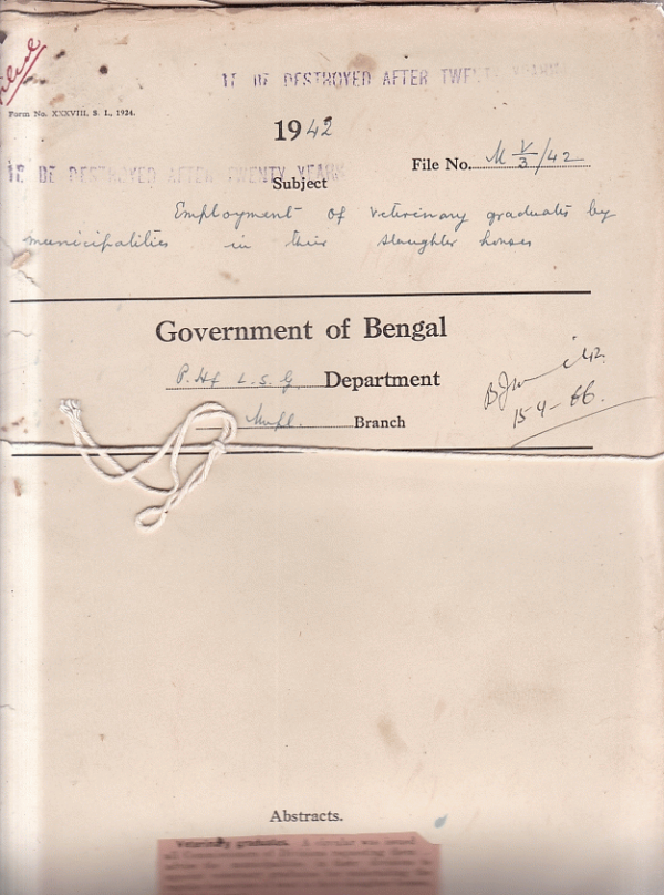 | Rack No. 13 , Bundle No. 25 , Sl No. 1714 L.A. by the Mymensingh Municipality for a starting a Municipality free primary school at Mymensingh. | Rack No. 13 , Bundle No. 25 , Sl No. 1715 L.A. by the Kustia Municipality for Muhammadan burial ground at Chourshansh. | Rack No. 13 , Bundle No. 25 , Sl No. 1716 L.A. by the Jalpaiguri Municipality for Bomboo, Fuel, and Jute market in word no. 5. | Rack No. 13 , Bundle No. 25 , Sl No. 1717 Employment of veterinary graduates by Municipalities in their Slaughter houses. | Rack No. 13 , Bundle No. 25 , Sl No. 1718 The Bengal Municipal Bill, 1941 by Mr. Nur Ahmed M.L.C. | Rack No. 13 , Bundle No. 25 , Sl No. 1719 Cal. 9 (Amendment) Bill 1941 by Mr. Hamidul Huq Chowdhury. | Rack No. 13 , Bundle No. 25 , Sl No. 1720 Limit of court fees Payable in assessment appeal cases under the Cal, Municipality Act, 1923 |
