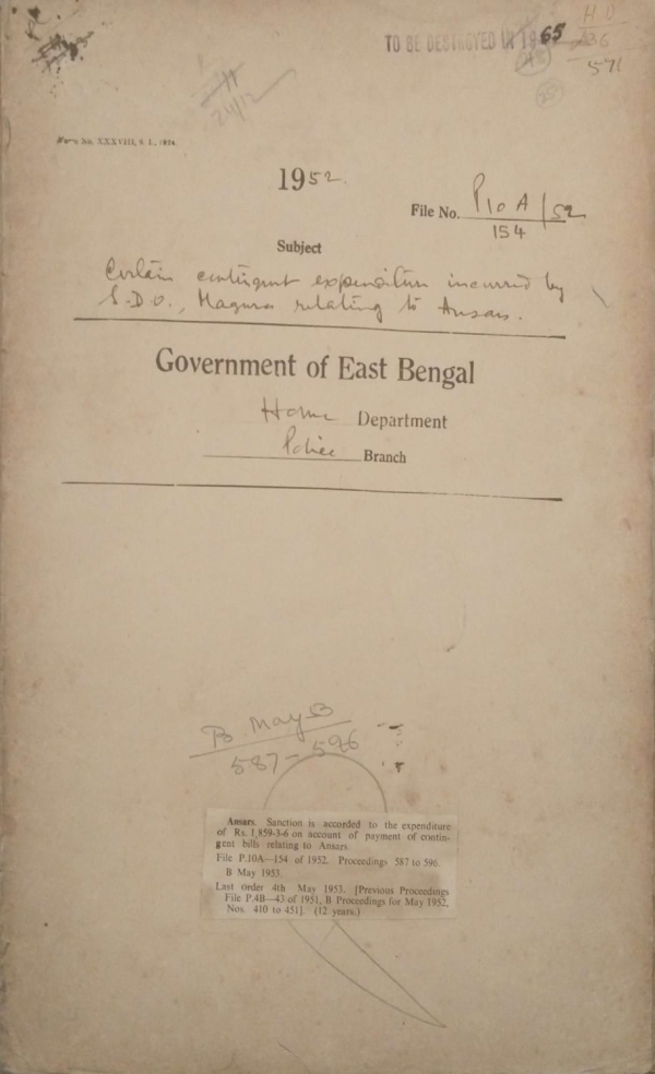 | Rack No. 25, Bundle No. 132, SI No. 12,200 Retention of the temporary staff for the Dacca and Chittagong Aerodromes. | Rack No. 25, Bundle No. 132, SI No. 12,201 Import of 50 trans/receiver sets by M/S. Forbes, Forbes Campbell and Co. Ltd. on Government account. | Rack No. 25, Bundle No. 132, SI No. 12,202 Application of the Provisions of the East Bengal (Smuggling) of Food grains Act, 1950 to Jute. | Rack No. 25, Bundle No. 132, SI No. 12,203 Allotment of funds for messing allowance of Ansars for 1950-51. | Rack No. 25, Bundle No. 132, SI No. 12,204 Grant of compassionate gratuity to the family of deceased inspector Mvi. A.H.M. Wahidul Hussain of the Tippera District Police. | Rack No. 25, Bundle No. 132, SI No. 12,205 Measures to be adopted for the Prevention of Wastage of Public Money. | Rack No. 25, Bundle No. 132, SI No. 12,206 Allotment of funds for the cost of type-writer for the Ansar directorate. |