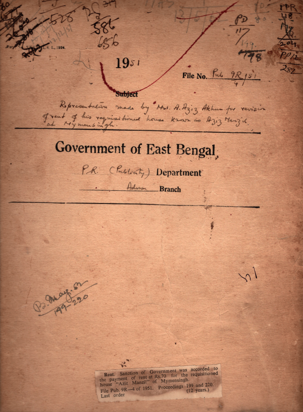 Compensation for the requisition of the house known as '' Aziz Manjil'' belonging to A. Aziz Akhun at Mymensingh.