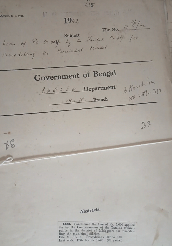 | Rack No. 13, Bundle No. 24, Sl No. 1634 Payment of Contribution of Rs. 50/- to the Serampore Sub-divisional Tuberculosis Association | Rack No. 13, Bundle No. 24, Sl No. 1635 L.A. by the Nalcity Municipality for a municipal burring Ghat in the village of Nandikati. | Rack No. 13, Bundle No. 24, Sl No. 1636 Affairs of the Dacca Municipality. | Rack No. 13, Bundle No. 24, Sl No. 1637 Loan of Rs. 50,000/- by the tamluk Municipality for remodeling the Municipal Market. | Rack No. 13, Bundle No. 24, Sl No. 1638 Adoption of model rules by the Madaripur Municipality regarding Appointment of Municipal officers and Servants. | Rack No. 13, Bundle No. 24, Sl No. 1639 Adoption of bye-laws u/s 434 of the B.M. Act, 1932 for regulation of Dairy & Milk Supply by the Comilla Municipality. | Rack No. 13, Bundle No. 24, Sl No. 1640 L.A. by Howrah Municipality for opening out a road off Bajalpara Lane Revision of the estimates. |