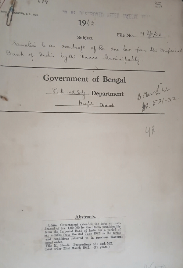 | Rack No. 13, Bundle No. 24, Sl No. 1644 The Survey of Kumarkhali Municipality. | Rack No. 13, Bundle No. 24, Sl No. 1645 of the Land at Bhamganj Surrendered by Mr. E. Keventer with hill men at reduced rates of rent and Salami | Rack No. 13, Bundle No. 24, Sl No. 1646 Adoption of model bye-laws prohibition and regulation of traffic by the Jiaganj Azimganj Municipality. | Rack No. 13, Bundle No. 24, Sl No. 1647 Sanction to an overdraft of Rs. One Lac from the imperial Bank of India by the Dacca Municipality. | Rack No. 13, Bundle No. 24, Sl No. 1648 L.A. by the Calcutta improvement Trust for alignment No. IV Maniktola. | Rack No. 13, Bundle No. 24, Sl No. 1649 L.A. by the Rishra-Konnagore Municipality for widening Nikashi drain in Pearabagan Lane. | Rack No. 13, Bundle No. 24, Sl No. 1650 L.A. by C.L.T. for Scheme No. XVI. inclusion of premises No. 21, Elliot Lane with in the Scheme. |