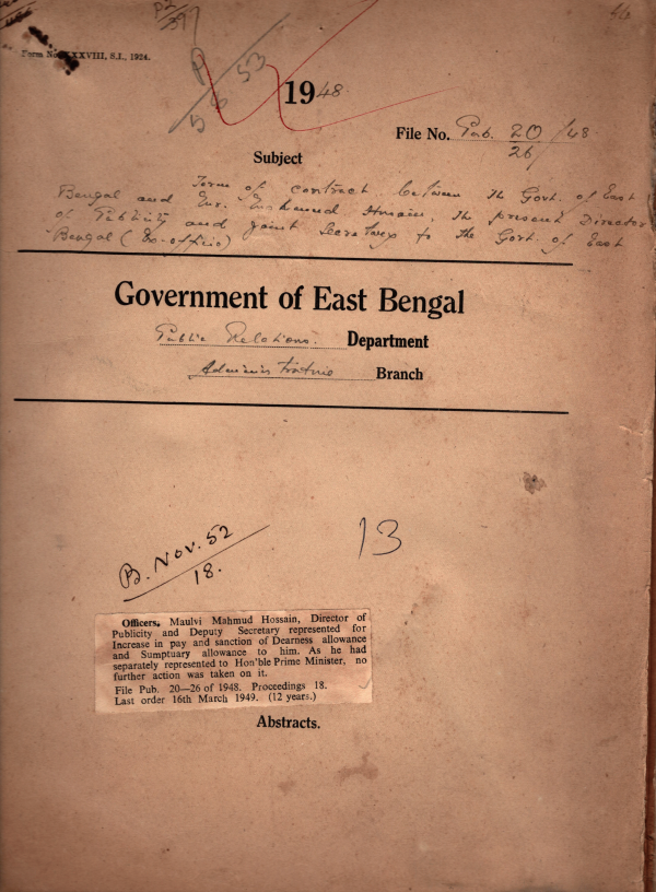 | Rack No. 18, Bundle No. 06, SI No. 376 Allotment of funds under ''25- General Administration Chief Secretary Office- Publicity Branch Contingencies Purchase of Books and Periodicals during 1947-48. | Rack No. 18, Bundle No. 06, SI No. 377 Question of Supply of press Cutting from newspapers in Mufassil Areas was dropped, | Rack No. 18, Bundle No. 06, SI No. 378 Civil Pioneer force (Central Retention of rank and wearing of uniform by the Commissioned Officers. | Rack No. 18, Bundle No. 06, SI No. 379 Mvi. Mahmud Hossain, Director of Publicity and Dy. Secretary represent for increase in pay and wearing of uniform by the Commisisioned Officers. | Rack No. 18, Bundle No. 06, SI No. 380 Revised estimates for the year, 1948-49 and Budget estimate for the year, 1949-50. | Rack No. 18, Bundle No. 06, SI No. 381 Verification of Service of Mvi, Abu Syeed D. Pub. O. Rajshahi. | Rack No. 18, Bundle No. 06, SI No. 382 Grant of Separation allowance to the Govt, Servants under the Govt. of East Bengal. |