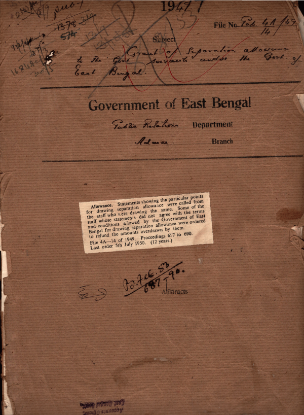 | Rack No. 18, Bundle No. 06, SI No. 379 Mvi. Mahmud Hossain, Director of Publicity and Dy. Secretary represent for increase in pay and wearing of uniform by the Commisisioned Officers. | Rack No. 18, Bundle No. 06, SI No. 380 Revised estimates for the year, 1948-49 and Budget estimate for the year, 1949-50. | Rack No. 18, Bundle No. 06, SI No. 381 Verification of Service of Mvi, Abu Syeed D. Pub. O. Rajshahi. | Rack No. 18, Bundle No. 06, SI No. 382 Grant of Separation allowance to the Govt, Servants under the Govt. of East Bengal. | Rack No. 18, Bundle No. 06, SI No. 383 Records regarding Separation of Assam without Prior approval of this Government. | Rack No. 18, Bundle No. 06, SI No. 384 List of Persons dismissed and debarred form future employment under Govt. | Rack No. 18, Bundle No. 06, SI No. 385 Report of D.P.O. Mymensingh in connection with the work of the medical officer of the D.M. Unit Mymensingh. |