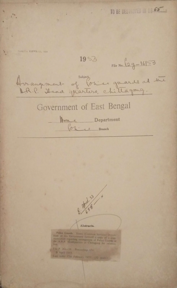 | Rack No. 25, Bundle No. 132, SI No. 12,232 Supply of Publications to the Indian high commission at Dacca. | Rack No. 25, Bundle No. 132, SI No. 12,233 Investigation Shri Ramesh Chandra Ghosh of Dakishan Chargoan P.S. Sreenagar, Dacca. | Rack No. 25, Bundle No. 132, SI No. 12,234 Exemption of Stipendiary magistrates from payment of fees for arms licenses. | Rack No. 25, Bundle No. 132, SI No. 12,235 Arrangement of Police guards at the A.R.P. headquarters at Chittagong. | Rack No. 25, Bundle No. 132, SI No. 12,236 Seizure of a gun belonging to Shri Hironlal Singh Roy by the government of East Bengal. | Rack No. 25, Bundle No. 132, SI No. 12,237 Extension of Sarai act (act no. XXII of 18679 to Chittagong Hill Tracts). | Rack No. 25, Bundle No. 132, SI No. 12,238 Addenda and Corrigenda to the P.R.B. 1943 for the quarter ending 31st December, 1952. |