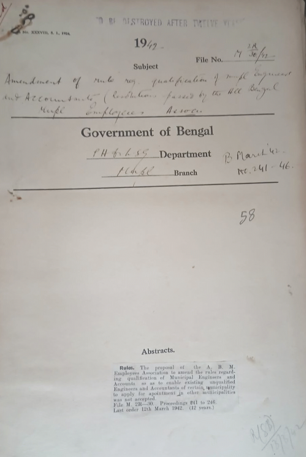 Amendment of rule regarding qualification of Municipal Engineers and Accountants Resolutions passed by the All Bengal Municipal Employee Association.