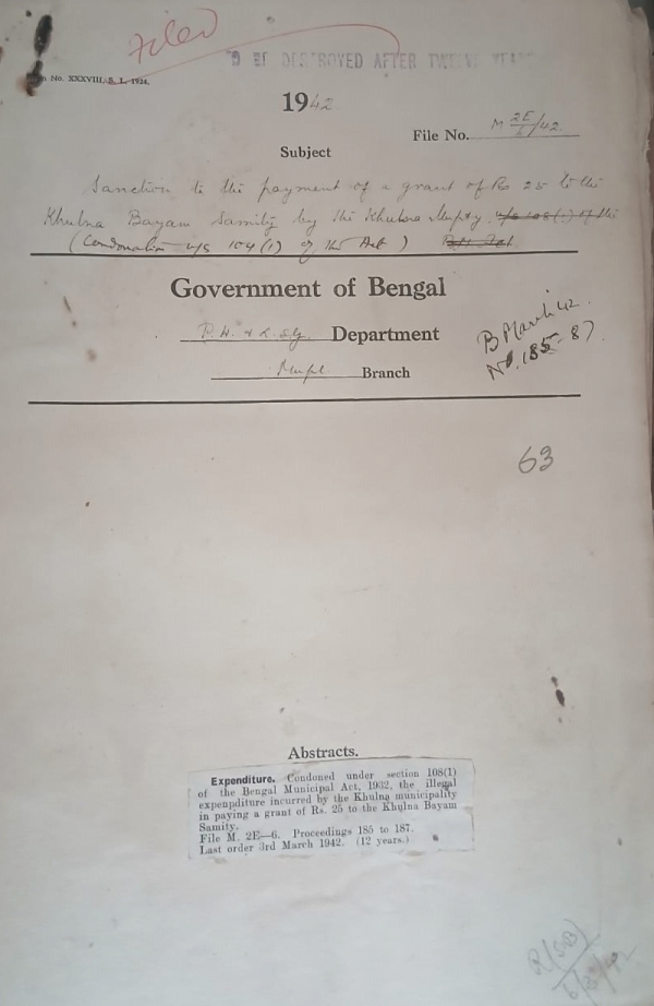 | Rack No. 13, Bundle No. 24, Sl No. 1660 Appointment of Mr. Profulla Ratan Mukherjee as Engineer of the Howrah Municipality. | Rack No. 13, Bundle No. 24, Sl No. 1661 Appointment of assessor by the Tollyganj Municipality. | Rack No. 13, Bundle No. 24, Sl No. 1662 Suspension of the execution of the resolution passed by the commissioners of the Dum Dum Municipality. | Rack No. 13, Bundle No. 24, Sl No. 1663 Sanction to the payment of a grant of Rs. 25 t the Khulna, Byam Samity by the Khulna Municipality. | Rack No. 13, Bundle No. 24, Sl No. 1664 Condonation of an expenditure of Rs. 10-11-6 from the accounts of the Serampore Municipality of the B.M. Act. | Rack No. 13, Bundle No. 24, Sl No. 1665 Proposal for extension of the term of the Dacca Municipality. | Rack No. 13, Bundle No. 24, Sl No. 1666 Sanction to the expenditure of Rs. 100/- & Rs. 500/-by the Serampore municipality an Serampore Municipality on account of grants to the Mobarly Technical School at Hooghly. |