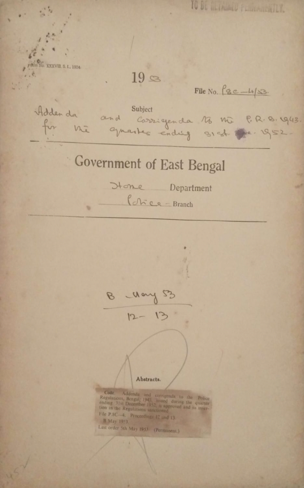 | Rack No. 25, Bundle No. 132, SI No. 12,235 Arrangement of Police guards at the A.R.P. headquarters at Chittagong. | Rack No. 25, Bundle No. 132, SI No. 12,236 Seizure of a gun belonging to Shri Hironlal Singh Roy by the government of East Bengal. | Rack No. 25, Bundle No. 132, SI No. 12,237 Extension of Sarai act (act no. XXII of 18679 to Chittagong Hill Tracts). | Rack No. 25, Bundle No. 132, SI No. 12,238 Addenda and Corrigenda to the P.R.B. 1943 for the quarter ending 31st December, 1952. | Rack No. 25, Bundle No. 133, Sl No. 12266 Police firing on 18.1052 at Shipsha and Alkikhal Crossing in the dist of Khulna. | Rack No. 25, Bundle No. 133, Sl No. 12267 Adjustment shortage in Cash and materials against govt. servants of Undivided Bengal on the date of Partition. | Rack No. 25, Bundle No. 133, Sl No. 12268 Medical Examination fee in respect of constables for E. Bengal Border Police. |