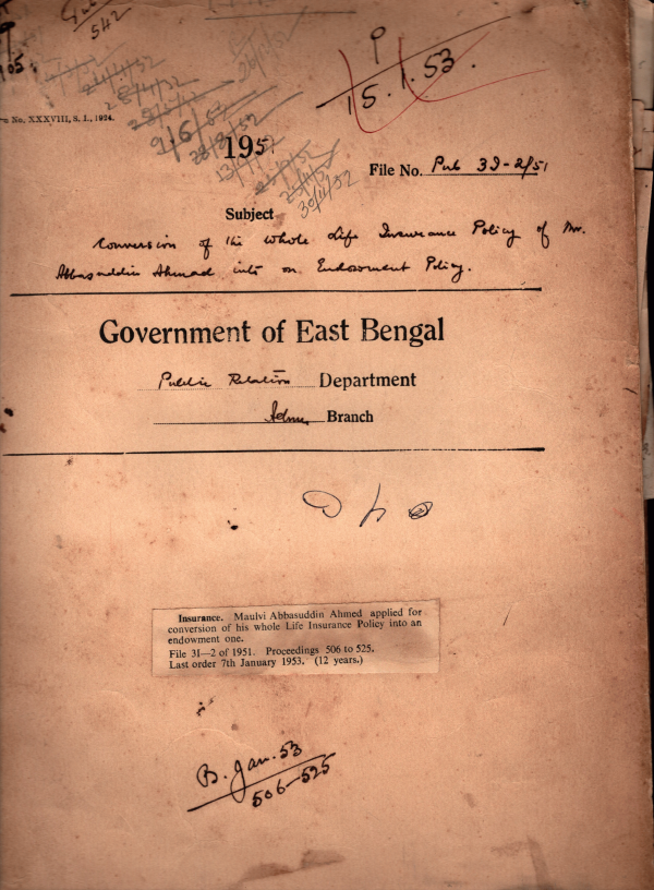 | Rack No. 18, Bundle No. 06, SI No. 395 Purchase of P.A. equipments etc for D.M. Unit, Pabna. | Rack No. 18, Bundle No. 06, SI No. 396 Transfer of Service records of displaced Govt. Servants. | Rack No. 18, Bundle No. 06, SI No. 397 Medicine Chest with Stand of D.M. Unit, Dacca. | Rack No. 18, Bundle No. 06, SI No. 398 Acceptance of Postal LP/56 Policy No. 18226C dated 2.6.38 in the name of Abbas- Uddin Ahmed as the liability of the Govt, of Pakistan. | Rack No. 18, Bundle No. 06, SI No. 399 Verification of Service of Babu Bimalananda Sarkar a compounder under the D.M. Unit. | Rack No. 18, Bundle No. 06, SI No. 400 Central civil Service Rules 1951. | Rack No. 18, Bundle No. 06, SI No. 401 Renewal of license for Phonographic Performance. |