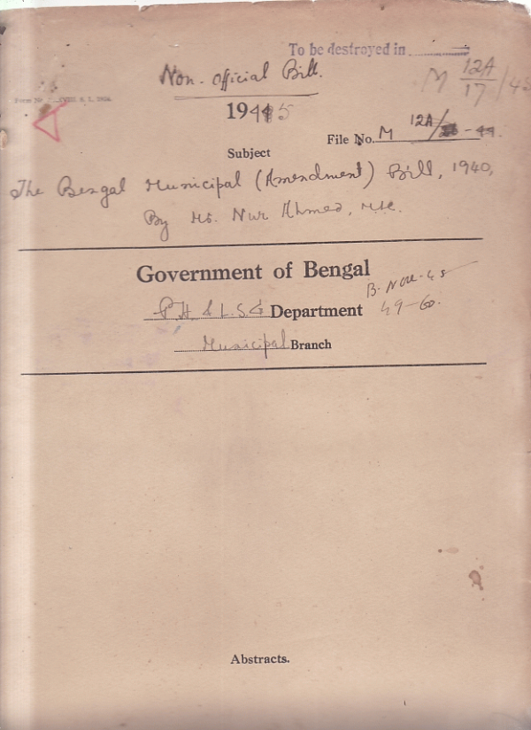 | Rack No. 13 , Bundle No. 25 , Sl No. 1722 Proposed grant of gratuity to the heirs of late Ataharjaman Khan collecting sircar of the Sirajgang Municipality. | Rack No. 13 , Bundle No. 25 , Sl No. 1723 L.A. by the Narayanganj Municipality for extension Burial Ground. | Rack No. 13 , Bundle No. 25 , Sl No. 1724 L.A. by the Dacca Municipality for opening a mathor's passage between Goilara and Mahajanpur lane. | Rack No. 13 , Bundle No. 25 , Sl No. 1725 The Bengal Municipal (Amendment) Bill, 1940 by Mr. Nur Ahmed, M.L.C. | Rack No. 13 , Bundle No. 25 , Sl No. 1726 Notes of Inspection of the Mymensingh Municipality. | Rack No. 13 , Bundle No. 25 , Sl No. 1727 Adoption of Model bye-laws for regulation and inspection of slaughter houses etc. by the Chittagong Municipality. | Rack No. 13 , Bundle No. 25 , Sl No. 1728 Adoption of draft bye-laws formed u/s 71(1) of Cal. Hackney carriage Act 1919 by the Kishorgonj Municipality. |