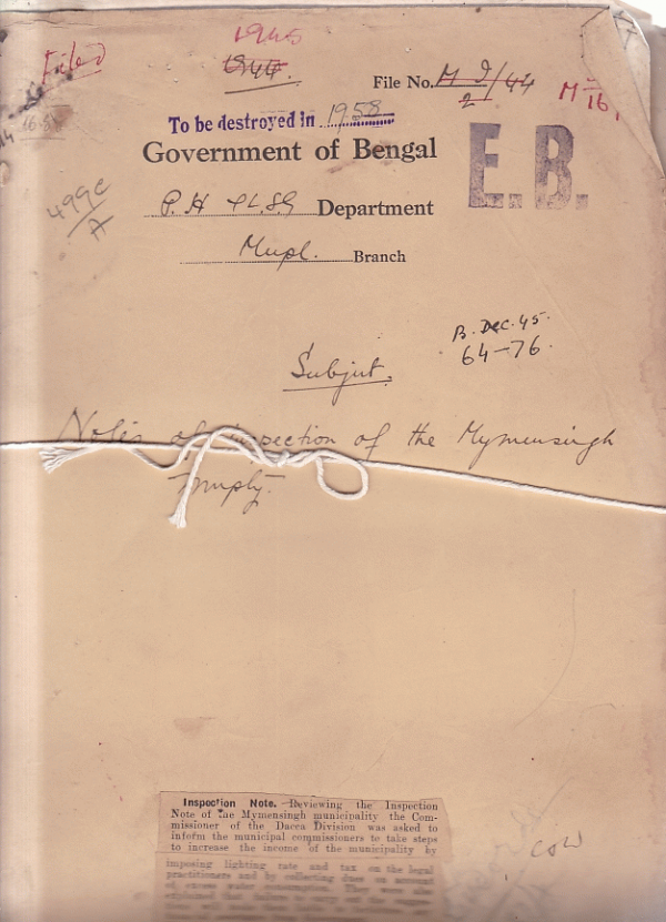 | Rack No. 13 , Bundle No. 25 , Sl No. 1723 L.A. by the Narayanganj Municipality for extension Burial Ground. | Rack No. 13 , Bundle No. 25 , Sl No. 1724 L.A. by the Dacca Municipality for opening a mathor's passage between Goilara and Mahajanpur lane. | Rack No. 13 , Bundle No. 25 , Sl No. 1725 The Bengal Municipal (Amendment) Bill, 1940 by Mr. Nur Ahmed, M.L.C. | Rack No. 13 , Bundle No. 25 , Sl No. 1726 Notes of Inspection of the Mymensingh Municipality. | Rack No. 13 , Bundle No. 25 , Sl No. 1727 Adoption of Model bye-laws for regulation and inspection of slaughter houses etc. by the Chittagong Municipality. | Rack No. 13 , Bundle No. 25 , Sl No. 1728 Adoption of draft bye-laws formed u/s 71(1) of Cal. Hackney carriage Act 1919 by the Kishorgonj Municipality. | Rack No. 13 , Bundle No. 25 , Sl No. 1729 L.A. by the Bogra Municipality for the extension improvement of Burring Ghat. |