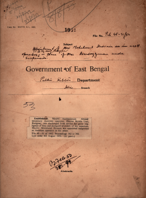 | Rack No. 18, Bundle No. 06, SI No. 409 Execution of Bond by Md. Asaf Ali, a permanent peon of this Department for working in the store of the Department. | Rack No. 18, Bundle No. 06, SI No. 410 Action taken against Mvi. Jalal Uddin Ahmed operator D.M. Unit Chittagong. | Rack No. 18, Bundle No. 06, SI No. 411 Establishment of a convention as to acceptance by Govt, of India in certain classes of cases of Advice tendered by the Public Service Commission | Rack No. 18, Bundle No. 06, SI No. 412 Suspension of Mvi. Asaduzzaman Ahmed, Assistant Operator D.M. Unit, Rangpur. | Rack No. 18, Bundle No. 06, SI No. 413 Petition for the post of District Public organizers and Sub- Divisional Public Organizer. | Rack No. 18, Bundle No. 06, SI No. 414 Grant of leave to District Organizer and Sub- divisional Public Organizer. | Rack No. 18, Bundle No. 06, SI No. 415 Report about the conduct of the assistant operator of the D,M, Unit. Mymensingh |