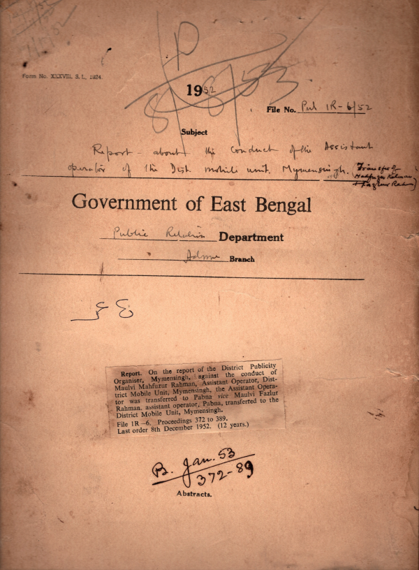 | Rack No. 18, Bundle No. 06, SI No. 412 Suspension of Mvi. Asaduzzaman Ahmed, Assistant Operator D.M. Unit, Rangpur. | Rack No. 18, Bundle No. 06, SI No. 413 Petition for the post of District Public organizers and Sub- Divisional Public Organizer. | Rack No. 18, Bundle No. 06, SI No. 414 Grant of leave to District Organizer and Sub- divisional Public Organizer. | Rack No. 18, Bundle No. 06, SI No. 415 Report about the conduct of the assistant operator of the D,M, Unit. Mymensingh | Rack No. 18, Bundle No. 06, SI No. 416 Submission of anonymous petitions against Govt, Servants. | Rack No. 18, Bundle No. 06, SI No. 417 Verification of Service of Sri Gashtha Behari Roy typist of this Department. | Rack No. 18, Bundle No. 06, SI No. 418 Toll @ of Annas 14/- per truck of 3 tons per day. |