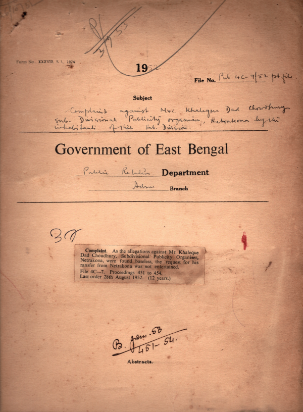 | Rack No. 18, Bundle No. 06, SI No. 432 Public of Second edition of East Bengal Civil list. | Rack No. 18, Bundle No. 06, SI No. 433 Mr. Jasim Uddin Song Public Organizes, was invited to join the Good will mission to Turkey as a member. | Rack No. 18, Bundle No. 06, SI No. 434 Verification of antecedents of class IV employees. | Rack No. 18, Bundle No. 06, SI No. 435 Resolution of the Sub-divisional Muslim league council against Mvi. Khaleque Dad Choudhury, S.D. Pub. Organizer Netrokona. | Rack No. 18, Bundle No. 06, SI No. 436 Appointment to the upper Selection grade posts in the Secretariat. | Rack No. 18, Bundle No. 06, SI No. 437 Drawing and disbursing officers under the Head ''6-B- Development -K-Miscellaneous" | Rack No. 18, Bundle No. 06, SI No. 438 Creation of two Posts of Drivers in the Public Relation Department. |