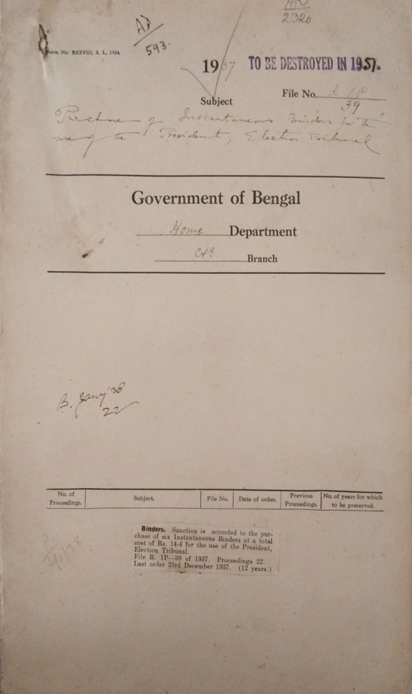 | Rack No. 08, Bundle No. 01, SI No. 02 Supply of a copy of report of election petition cases to the Govt. of the Punjab. | Rack No. 08, Bundle No. 01, SI No. 03 Form of agreements indentures etc. between Govt. and other parties. | Rack No. 08, Bundle No. 01, SI No. 04 Procedure for sending papers to the Record Room. | Rack No. 08, Bundle No. 01, SI No. 05 Purchase of Instantaneous Binders for the use of the President, Election Tribunal. | Rack No. 08, Bundle No. 01, SI No. 06 Appointment of a temporary Clerk in the office of the C.P.M., Calcutta for work in connection with election. | Rack No. 08, Bundle No. 01, SI No. 07 Address of welcome to His Excellency lord Brabourne by the Bengal Mahajan Sabha. | Rack No. 08, Bundle No. 01, SI No. 08 T.A. of commissioners appointed for the trial of election petitions. |