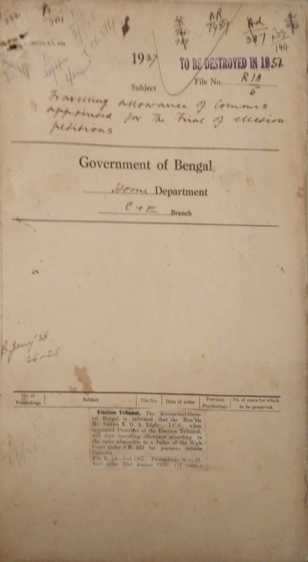 | Rack No. 08, Bundle No. 01, SI No. 05 Purchase of Instantaneous Binders for the use of the President, Election Tribunal. | Rack No. 08, Bundle No. 01, SI No. 06 Appointment of a temporary Clerk in the office of the C.P.M., Calcutta for work in connection with election. | Rack No. 08, Bundle No. 01, SI No. 07 Address of welcome to His Excellency lord Brabourne by the Bengal Mahajan Sabha. | Rack No. 08, Bundle No. 01, SI No. 08 T.A. of commissioners appointed for the trial of election petitions. | Rack No. 08, Bundle No. 01, SI No. 09 Report to the princes on Federation Mr. J.H. Morgaon, K.C. | Rack No. 08, Bundle No. 01, SI No. 10 Amendment to the G.P. fund Rules. | Rack No. 08, Bundle No. 01, SI No. 11 Revision of the lists of officials authorized to send (i) clear the line (ii) Priority and (iii) Special police telegrams to Burma owing to the separation of Burma. |