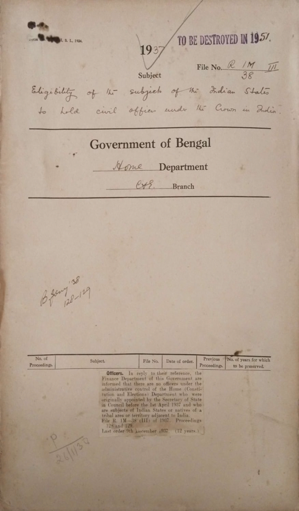 | Rack No. 08, Bundle No. 01, SI No. 15 Appointment of an Additional Peon for Additional Secretary while in charge of the Reforms Office. | Rack No. 08, Bundle No. 01, SI No. 16 Bye election in the land Malda North (Rural) Muhammadan constituency of the Bengal Legislative Assembly Vice Mr. Zahur Ahmed Chowdhury, whose election has been declared Void by the Election Tribunal. | Rack No. 08, Bundle No. 01, SI No. 17 Address Presented to H.E. the Governor of Bengal by the Bengal Land holders Association and H. E’s reply to it. | Rack No. 08, Bundle No. 01, SI No. 18 Eligibility of the Subject of the Indian States to hold officers under the Crown in India. | Rack No. 08, Bundle No. 01, SI No. 19 Revision of India Office List. | Rack No. 08, Bundle No. 01, SI No. 20 State provision Bill for stud Bill, 1937 by Khan Bahadur Muhammad Ali, M.L.A. | Rack No. 08, Bundle No. 01, SI No. 21 Attendance of a draftsman at the meetings of Select committees of the Legislature. |