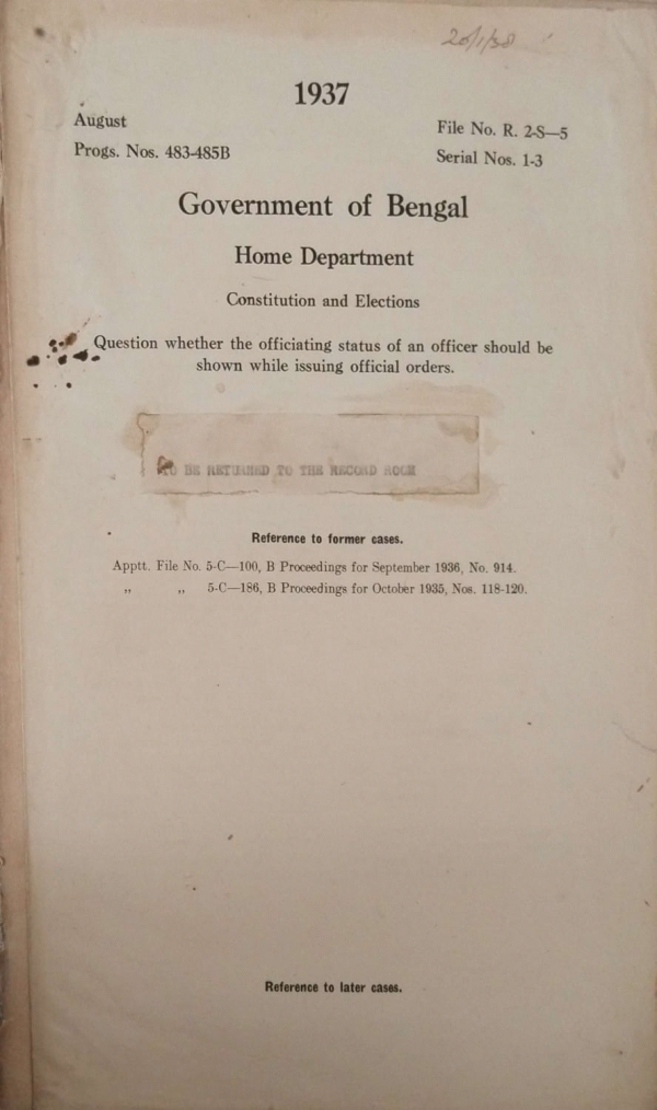 | Rack No. 08, Bundle No. 01, SI No. 22 Enquiry about the eligibility of Govt. Pleaders to stand for being members of the Provincial Legislature. | Rack No. 08, Bundle No. 01, SI No. 23 Taking of Oaths by members of the Bengal Legislative Assembly when the Assembly in not in Session. | Rack No. 08, Bundle No. 01, SI No. 24 Creation of a permanent Election Department in the Corporation of Calcutta. | Rack No. 08, Bundle No. 01, SI No. 25 Question whether the officiating status of an officer Should be Shown while issuing official orders. | Rack No. 08, Bundle No. 01, SI No. 26 Expenditure in connection with the general elections. | Rack No. 08, Bundle No. 01, SI No. 27 Washing charges of liveries in the offices of the Heads of Department. | Rack No. 08, Bundle No. 01, SI No. 28 Expenditure in connection with the bye-election in the Malda North Muhammadan Constituency of the Bengal Legislative Assembly. |