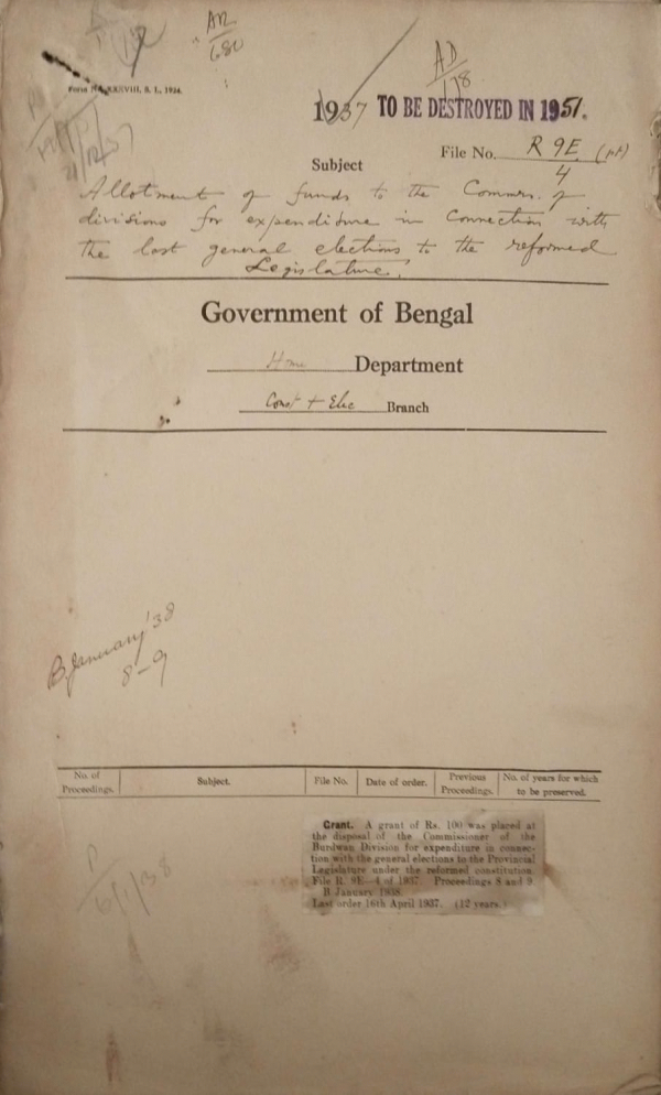 | Rack No. 08, Bundle No. 01, SI No. 23 Taking of Oaths by members of the Bengal Legislative Assembly when the Assembly in not in Session. | Rack No. 08, Bundle No. 01, SI No. 24 Creation of a permanent Election Department in the Corporation of Calcutta. | Rack No. 08, Bundle No. 01, SI No. 25 Question whether the officiating status of an officer Should be Shown while issuing official orders. | Rack No. 08, Bundle No. 01, SI No. 26 Expenditure in connection with the general elections. | Rack No. 08, Bundle No. 01, SI No. 27 Washing charges of liveries in the offices of the Heads of Department. | Rack No. 08, Bundle No. 01, SI No. 28 Expenditure in connection with the bye-election in the Malda North Muhammadan Constituency of the Bengal Legislative Assembly. | Rack No. 08, Bundle No. 01, SI No. 29 Pay of Babu Lal Pathak, an assistant of the Home (C+E), Department. |
