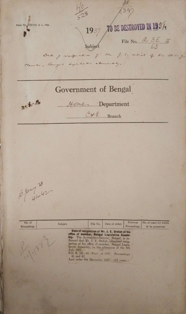| Rack No. 08, Bundle No. 01, SI No. 27 Washing charges of liveries in the offices of the Heads of Department. | Rack No. 08, Bundle No. 01, SI No. 28 Expenditure in connection with the bye-election in the Malda North Muhammadan Constituency of the Bengal Legislative Assembly. | Rack No. 08, Bundle No. 01, SI No. 29 Pay of Babu Lal Pathak, an assistant of the Home (C+E), Department. | Rack No. 08, Bundle No. 01, SI No. 30 Date of resignation Mr. J.E. Ordish of his office of member Bengal Legislative Assembly. | Rack No. 08, Bundle No. 01, SI No. 31 Grant for the upkeep of the Bengal Legislative Assembly Department Library. | Rack No. 08, Bundle No. 01, SI No. 32 Supply of information regarding elections to the proportional Representation Society, London. | Rack No. 08, Bundle No. 01, SI No. 33 Return Showing the results of elections in India 1937. |