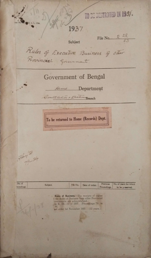 | Rack No. 08, Bundle No. 01, SI No. 35 Proposal prosecution of My Yusuf Mirza, M.L.A. U/S 1711 of the Indian Penal Code. | Rack No. 08, Bundle No. 01, SI No. 36 Tour of Ministers. | Rack No. 08, Bundle No. 01, SI No. 37 Mode of sending communication to the Department of Co-operative Credit and Rural Indebtedness. | Rack No. 08, Bundle No. 01, SI No. 38 Rules of Executive Business of other Provincial Govt. | Rack No. 08, Bundle No. 01, SI No. 39 Particulars of persons entitled to religious ministrations. | Rack No. 08, Bundle No. 01, SI No. 40 Changes in the Jurisdiction of Certain Munsif’s. | Rack No. 08, Bundle No. 01, SI No. 41 Installation of an inter departmental telephone system in the Bengal Legislative Assembly Department. |