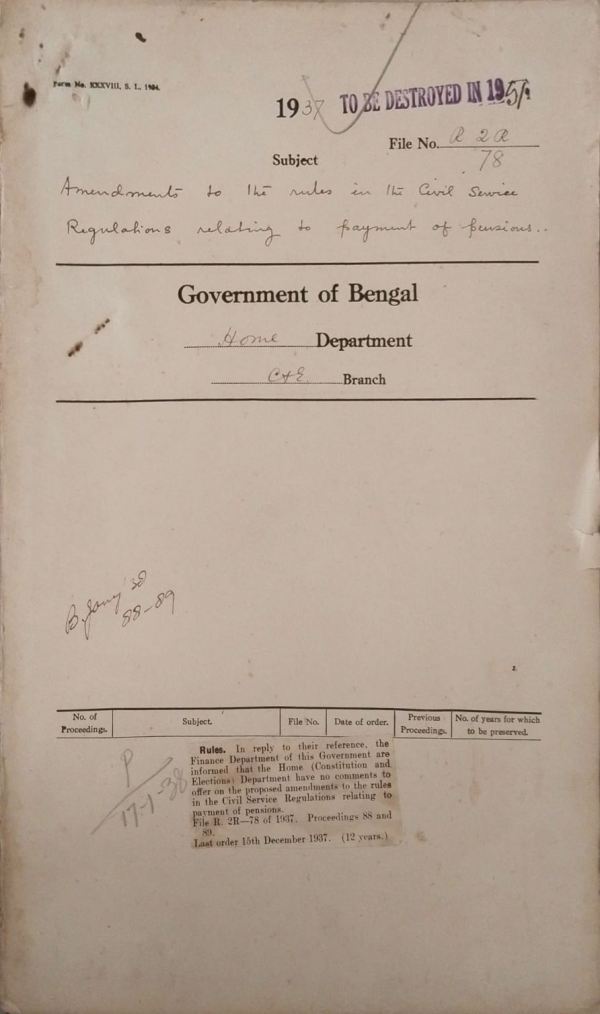 | Rack No. 08, Bundle No. 01, SI No. 39 Particulars of persons entitled to religious ministrations. | Rack No. 08, Bundle No. 01, SI No. 40 Changes in the Jurisdiction of Certain Munsif’s. | Rack No. 08, Bundle No. 01, SI No. 41 Installation of an inter departmental telephone system in the Bengal Legislative Assembly Department. | Rack No. 08, Bundle No. 01, SI No. 42 Amendments to the rules in the Civil Service Regulations relating to payment of pensions. | Rack No. 08, Bundle No. 01, SI No. 43 Defects in the returns of election expenses by Mr. O.K. Martin and Mrs. Ellen West. | Rack No. 08, Bundle No. 01, SI No. 44 Distribution of Copies of the Bengal Legislative Assembly rule and standing orders and the Bengal Legislative Council Rules and Standing Orders. | Rack No. 08, Bundle No. 01, SI No. 45 Adaptations and modifications U/S 84(3) of the Govt. of India Act, 1935. |