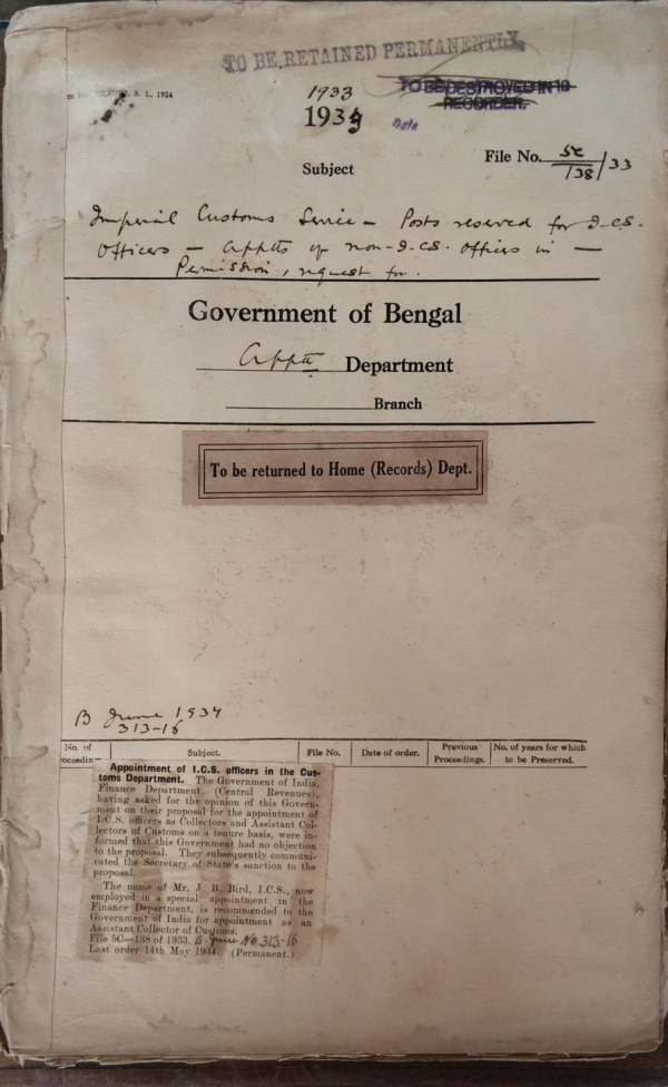 | Rack No. 2, Bundle No. 01, Sl No. 21 Extension of leave of Babu Hem. Ch. Pathak, Sub-Deputy. Collector. | Rack No. 2, Bundle No. 01, Sl No. 25 Proposal for the creation of a special post for Mr. J.A. Beale, Deputy. Magistrate and Deputy. Collector, Posted to Murshidabad. | Rack No. 2, Bundle No. 3, Sl No. 130 Passports for journey to the straits settlement and the federated Malay States. | Rack No. 2, Bundle No. 6, Sl No. 304 I.C.S. posts reserved for I.C.S. officer Appointment of non I.C.S. officer. | Rack No. 2, Bundle No. 6, Sl No. 307 Purchase of the report of the Joint Committee on the Indian Constitutional Reform. | Rack No. 2, Bundle No. 6, Sl No. 311 Scale of pay for Estt. Menials. | Rack No. 2, Bundle No. 6, Sl No. 315 Question of selection of Mr. T.I. M.N. Chawdhury I.C.S. for the prison administration course held in England. |
