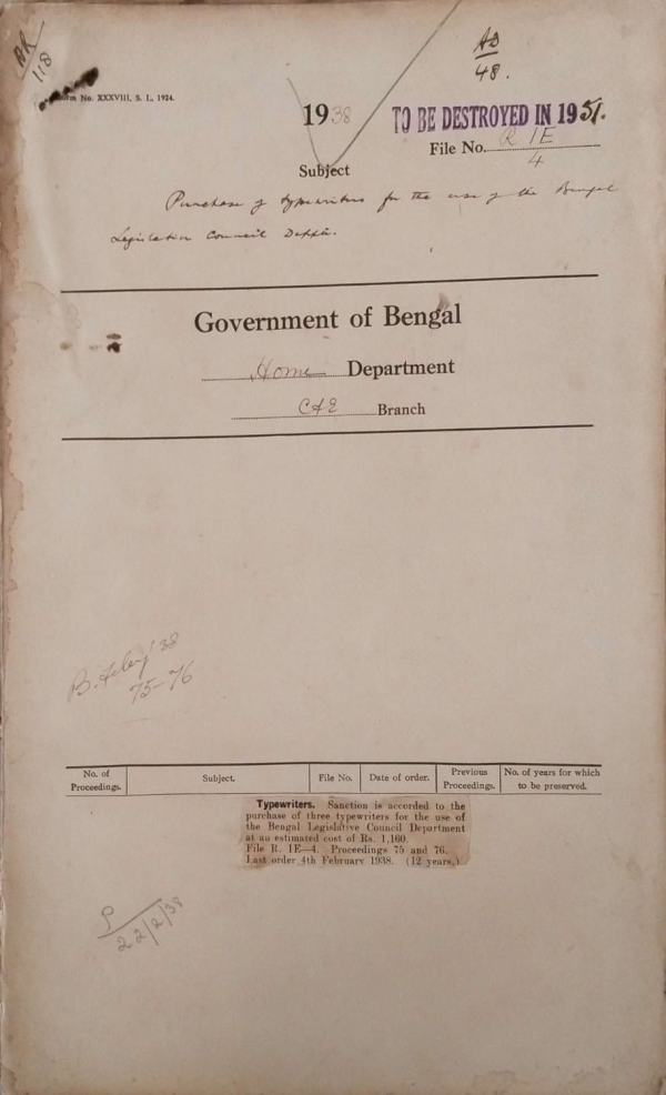 Purchase of typewriters for the use of the Bengal legislative council Department.