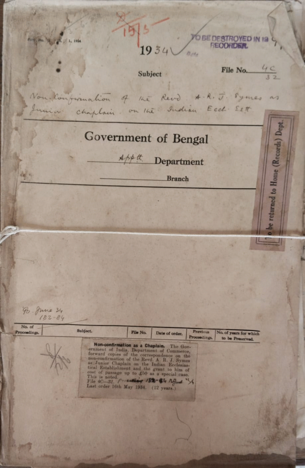 | Rack No. 2, Bundle No. 6, Sl No. 303 Nomination of Maharaja Jagadish Nath Roy of Dinajpur to the Council of state. | Rack No. 2, Bundle No. 6, Sl No. 305 Installation of Electric lights and fans in the Church at Comilla. | Rack No. 2, Bundle No. 6, Sl No. 306 Personal pay of Mr. H.E. Hansen of the Indian Police. | Rack No. 2, Bundle No. 6, Sl No. 308 Non-confirmation of the Revd. A.R.J. Symes as Junior Chaplain on the Indian Ecel. Estt. | Rack No. 2, Bundle No. 6, Sl No. 309 Superannuation pension of Mr. P.C. Roy, retired Additional District & Session Judge. | Rack No. 2, Bundle No. 6, Sl No. 310 Proposal to vest. Babu A.K. Sen, Deputy Magistrate, Asansol, Burdwan with power under section 110 of Criminal Procedure Code. | Rack No. 2, Bundle No. 6, Sl No. 312 Issue of a certificate of transfer in connection with the transfer of Mr. A. Ahmed, I.C.S. from Calcutta. |