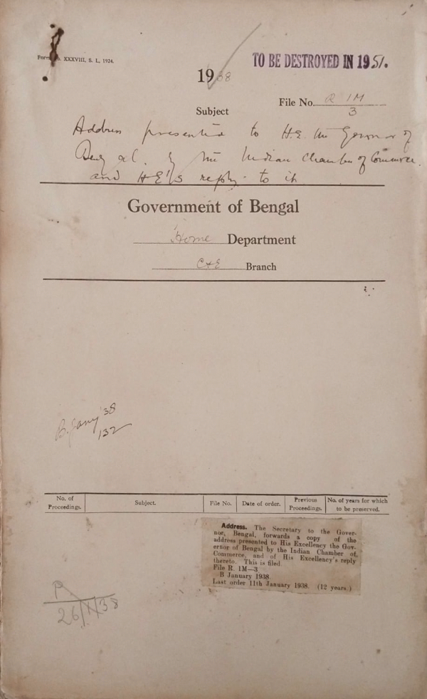 Address presented to H.E. the Governor of Bengal by the Indian Chamber of Commerce and H. E’S repair to it.
